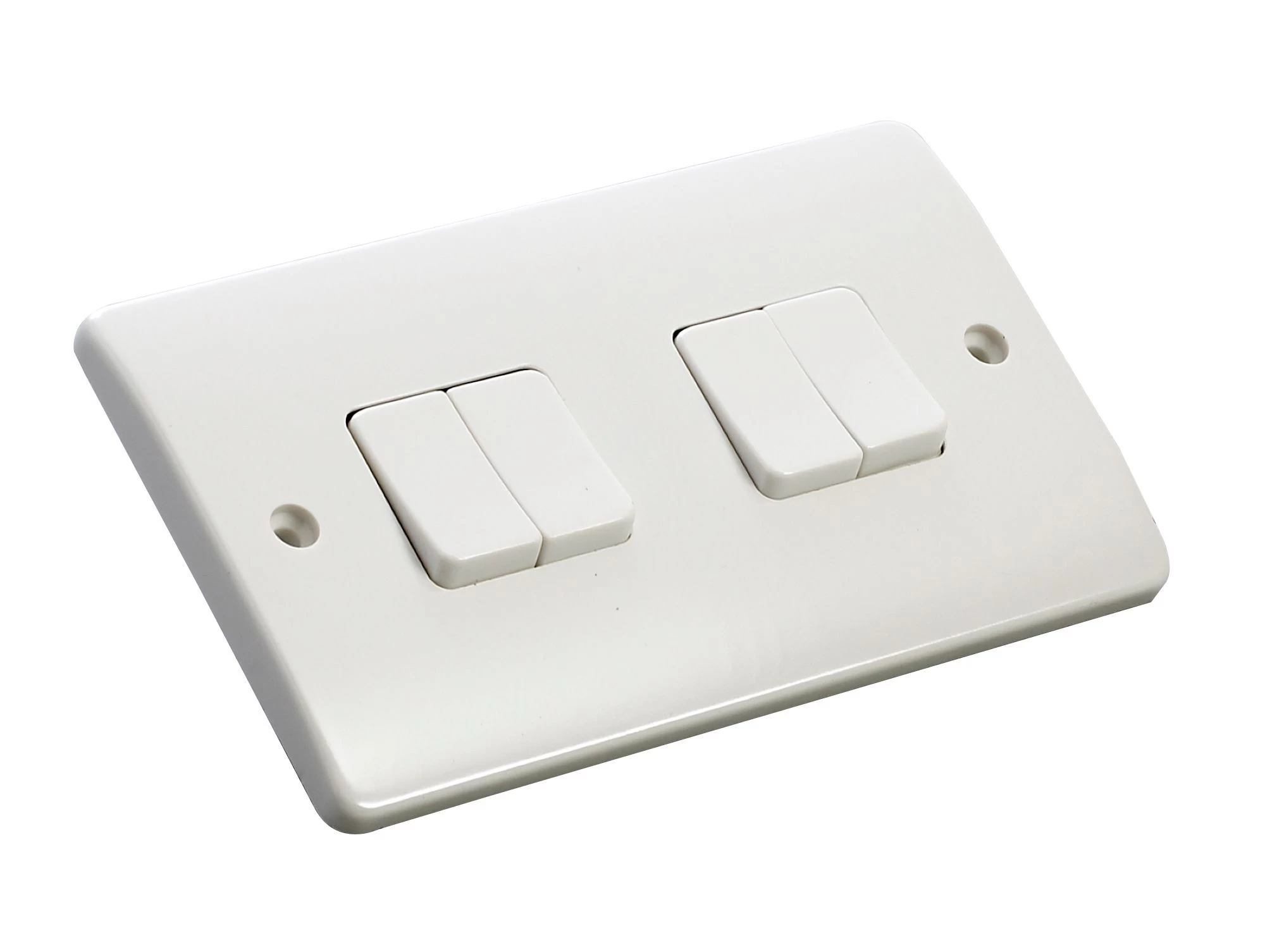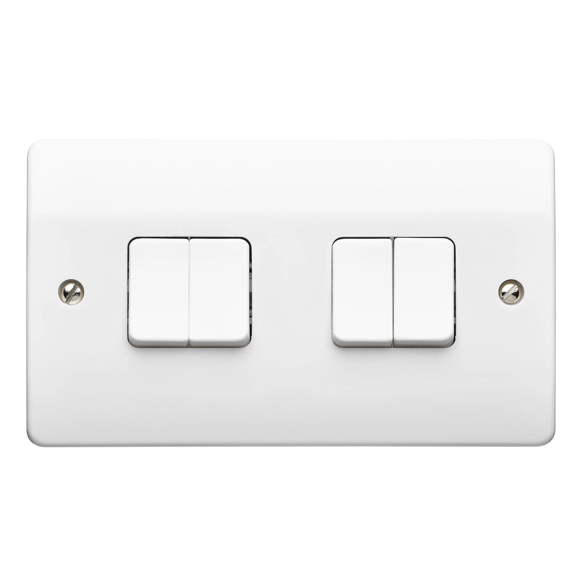 Raised screwed profile light switch with plastic gloss white finish. 4 gang internal switch, ideal for controlling 4 circuits. 2 way switches make it possible to control the same light from 2 locations.